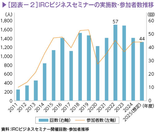 IRCでは、階層別(経営層/管理職/若手・中堅など)や職種・分野別(経理や人事、ビジネススキル)のビジネスセミナーを開催している。図表2は、2011年からのビジネスセミナーの開催回数と参加者の推移を示したものである。