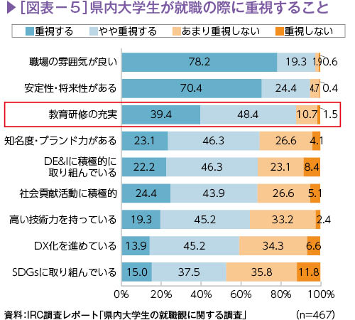近年、学生は就職の際に自身の「やりがい」や「達成感」を重視する傾向にあるが、「就職先に求めること」では、職場の雰囲気の良さ、安定性・将来性などに次いで、「教育研修の充実」を挙げる学生が9割近くを占めていることがわかる。人材育成への取り組みやその発信が、実は採用にも大きな影響を及ぼしていると考えられる。