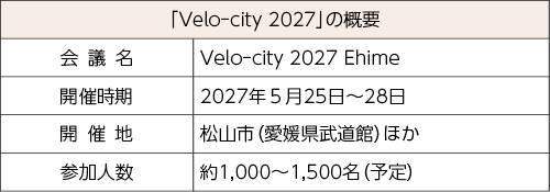 今年1月、2027年の「Velo‒city」の開催が愛媛に決定したことが発表された。日本での開催は初めてで、アジアでも2016年の台湾(台北)以来2回目の開催となる。