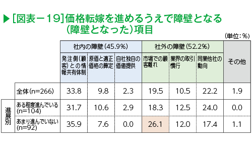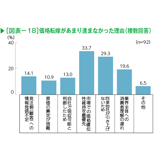 一方、「あまり進んでいない」企業では、「市場での価格優位性維持を最優先」「同業他社が引き上げないため」がそれぞれ約3割を占める(図表-18)。自社は値上げしたくても消費者の反応や他社の動向から価格を維持せざるを得ない現状がうかがえる。