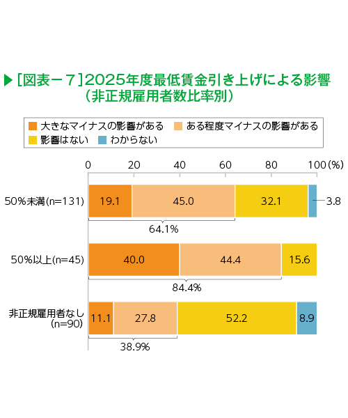 非正規雇用者数の比率別にみると、「マイナスの影響がある」との回答は「非正規雇用者なし」の企業では4割に満たない一方で、「50%以上」では8割超に上る。比率が高いほど、マイナスの影響が大きいといえる(図表-7)。