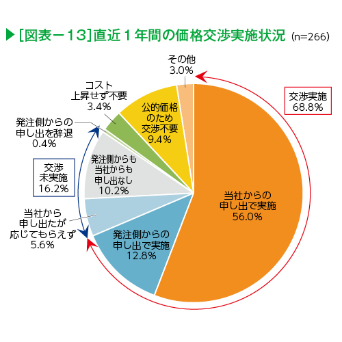 直近1年間の価格交渉状況を尋ねたところ、「当社からの申し出で実施」が56.0%と最も多く、次いで「発注側からの申し出で実施」が12.8%となり、全体の約7割が価格交渉を実施している。交渉未実施の企業が2割近くあるものの、概ね価格交渉には着手できている(図表-13)。