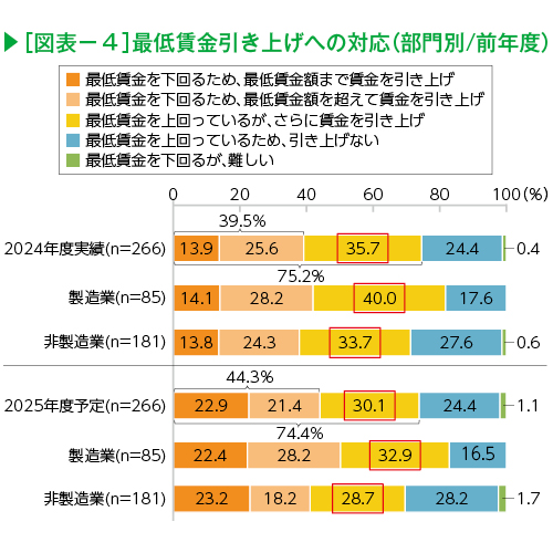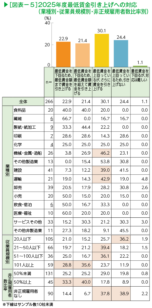 業種別(「その他」とサンプル数10社未満を除く)でみると、安定した受注のために人材を確保しようとする「機械・金属・造船」や、社員定着率向上のために労働環境の改善に取り組む「建設」「運輸」で、「上回っているがさらに引き上げる」が全体を大きく上回った(図表−5)。