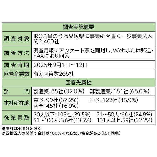 12月から愛媛の最低賃金は1,033円に改定され、初めて1,000円を超える。近年の賃上げ機運の高まりや長引く物価上昇への対応が求められるなか、今回の大幅な最低賃金引き上げは企業への影響が大きいと予想される。また、社会全体が低成長・低賃金から脱しつつある今、企業は人件費増加を前提とした経営に転換する必要がある。そこで、県内企業を対象に最低賃金引き上げが及ぼす影響と、考えられる対応策の1つとして価格転嫁にスポットを当てたアンケートを実施した。今回は、その結果を中心に現状と課題についてレポートする。