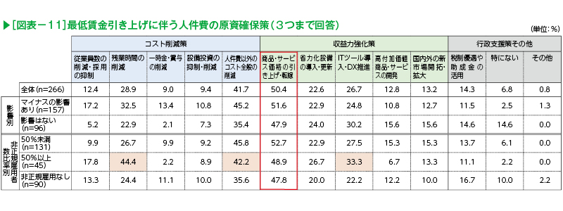 全体では「商品・サービス価格の引き上げ・転嫁」(以下「価格転嫁」)が50.4%で最も多く、「人件費以外のコスト全般の削減」(41.7%)が続いた(図表-11)。対策を「コスト削減策」「収益力強化策」「行政支援その他」に分類すると、「マイナスの影響がある」と回答した企業でコスト削減に注力しようとする傾向が強い。
