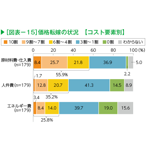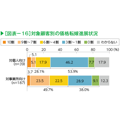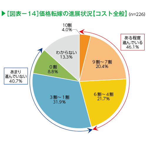「10割」はわずか4.0%だったが「9割~7割」が20.4%、「6割~4割」が21.7%で続き、転嫁割合4割以上の「ある程度進んでいる」(以下同)企業は約5割となった(図表-14)。