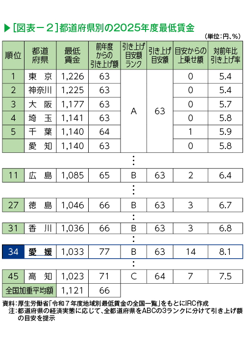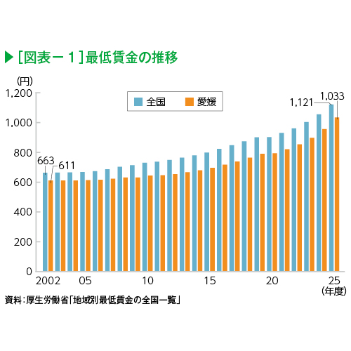 1. 2025年の愛媛の最低賃金は、国から示された目安額63円を大幅に上回る過去最大の77円引き上げとなり1,033円に改定され、初めて1,000円を超える。引き上げ率は8.1%となり、時給表示に統一された2002年度以降で最大だった前年度(6.6%)を上回った。