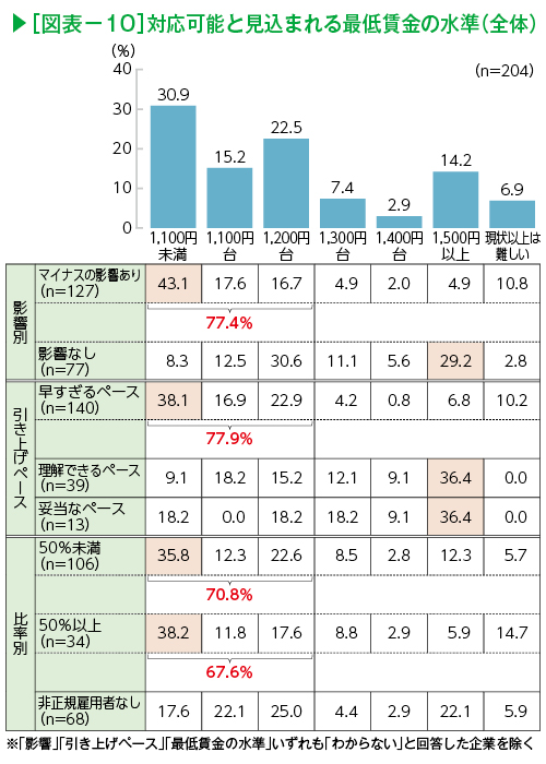 現在の経済環境や見通しをもとに、対応可能と見込まれる最低賃金の水準(「わからない」を除く)を尋ねたところ、「1,100円未満」が30.9%で最も多い(図表-10)。「マイナスの影響がある」と回答した企業や引き上げペースを「早すぎる」と捉えている企業、非正規社員を雇用する企業でより顕著となった。一方、影響がない企業や引き上げペースに理解を示す企業では「1,500円以上」との回答が多く、今後の対応見通しは分かれた。