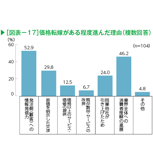 転嫁状況が「ある程度進んだ」企業の理由では、「発注側(顧客)への情報発信力」(52.9%)が最も多い(図表-17)。ある食料品製造業では納品先と一緒に仕入現場を回ることでコスト上昇を共有した