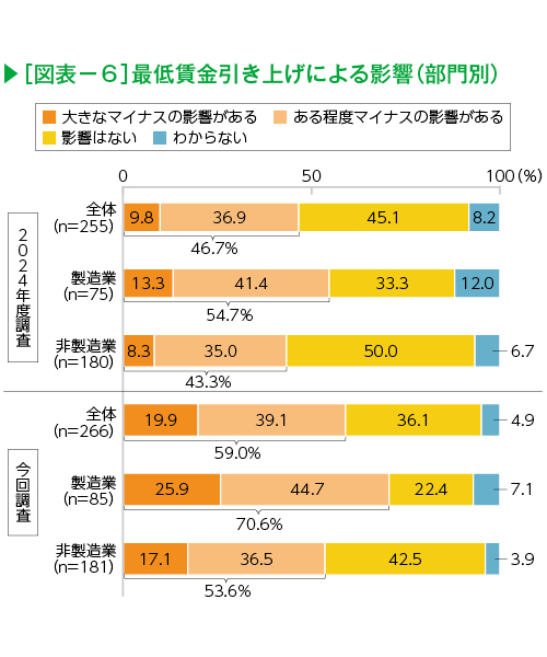 全体では、59.0%が「マイナスの影響がある」(「大きなマイナスの影響がある」+「ある程度マイナスの影響がある」、以下同)と回答し、前年度より約12ポイント増加した(図表-6)。部門別でみた「マイナスの影響がある」は、対前年比で「製造業」が約16ポイント、「非製造業」が約10ポイントとそれぞれ大幅に増加し、今回の引き上げが及ぼす影響の大きさがうかがえる。