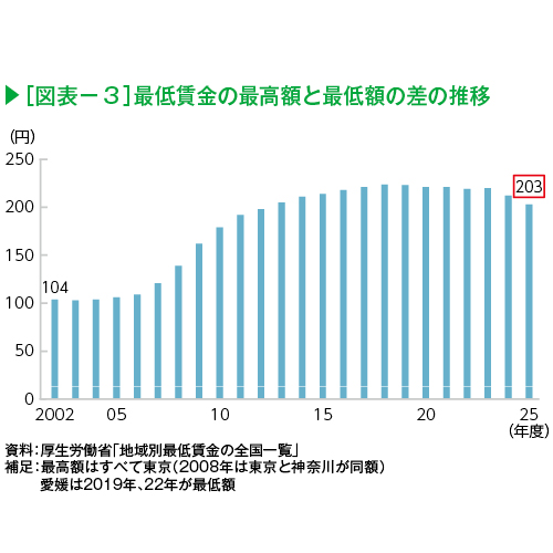 しかしながら、都道府県別の最高額と最低額の差をみると、今回の大幅引き上げで若干縮小したものの依然として200円台が続いており、地域間格差の改善は進んでいない(図表-3)。