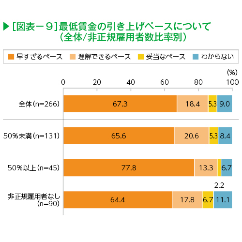 政府目標である「2020年代に全国加重平均1,500円」に向けて、今回と同程度の引き上げ幅が継続することに対して、全体の67.3%の企業が「早すぎるペース」と捉えている(図表-9)。非正規雇用者数の比率別でみても、雇用の有無に関わらず「早すぎる」が最も多く、特に50%以上の企業では77.8%と全体を約10ポイント上回った。