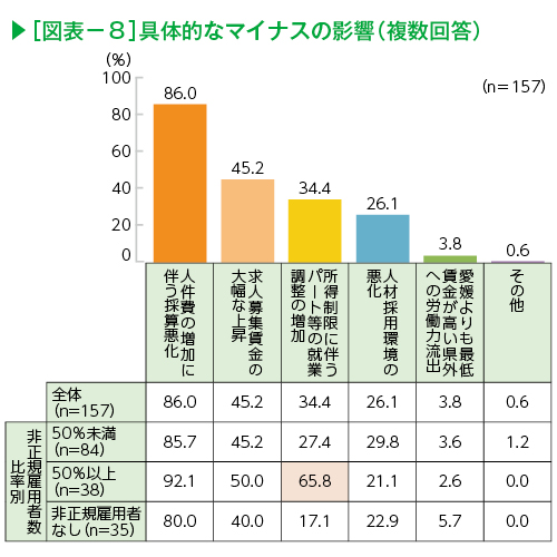 「マイナスの影響がある」と回答した企業に具体的な影響を尋ねたところ、全体の86.0%が「人件費の増加に伴う採算悪化」と回答した(図表-8)。非正規雇用者数の比率が高いほどその傾向は強く、春闘実績やIRC調査の賃上げ見通しを超える引き上げ幅のため、正規社員の賃金水準も上げざるを得ないことが企業の人件費負担をさらに重くするものと考える。