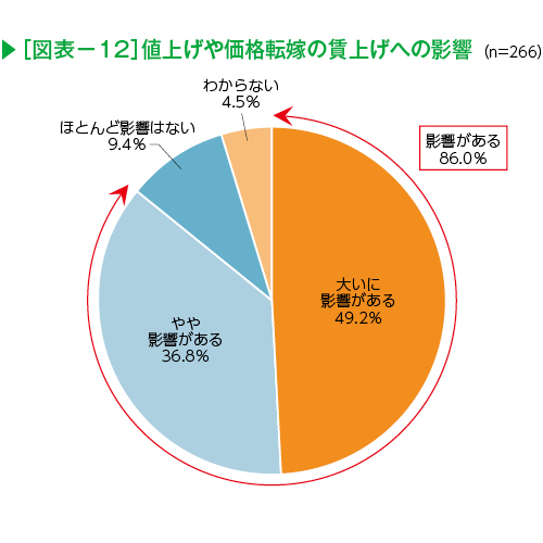 足元での原資確保策として最も多かった価格転嫁だが、実際の賃上げや賞与支給の判断にどの程度影響するかを尋ねたところ、86.0%の企業が「影響がある」(「大いに影響がある」+「やや影響がある」)と回答した(図表-12)。価格転嫁は、企業の賃上げ動向を左右するといえる。