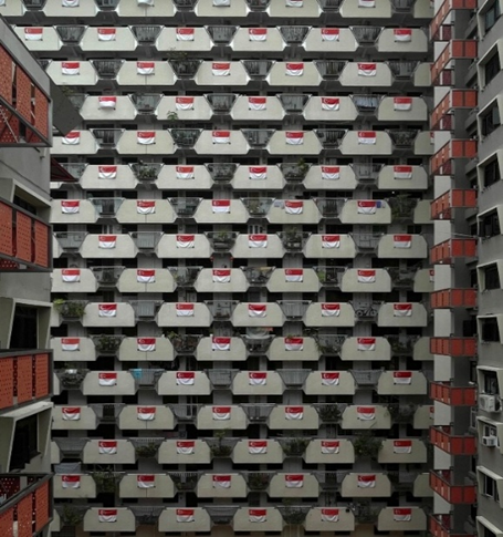 公営住宅のSelegie Houseでは、ナショナルデーが近づくと、各階のバルコニーに国旗が掲げられ、この時期の風物詩として人気スポットになっています。