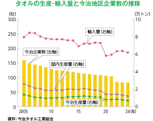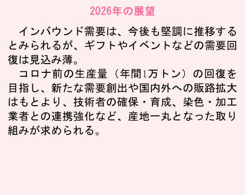 今年のタオル生産量は、今治地区綿糸受渡数量の推移をもとに推計すると、昨年(6,857トン)をやや下回る6,500トン前後となる見込みである。コロナ禍の2020年以降、生産量は減少が続いており、2019年比の生産量は3割以上落ち込んでいる。