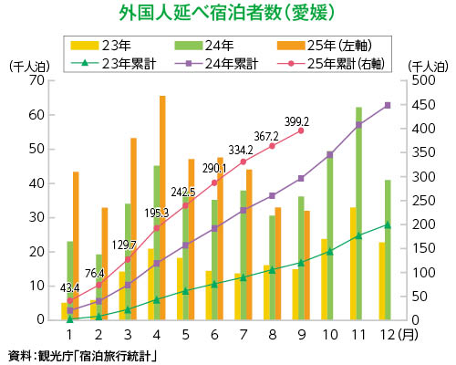 外国人延べ宿泊者数(1~9月)は39万9千人(前年同期比+33.4%)と、前年を大きく上回っており、2019年比では約2.5倍となった。昨年10月27日以降、国際線「松山-ソウル線」(週12便→週14便)、「松山-釜山線」(週3便→週7便)、「松山-台北線」(週2便→週3便)の増便がインバウンド需要の増加に大きく寄与した。現在、国際線は過去最多の週24便が運航しており、今後も東アジアを中心としたインバウンドの増加が期待される。