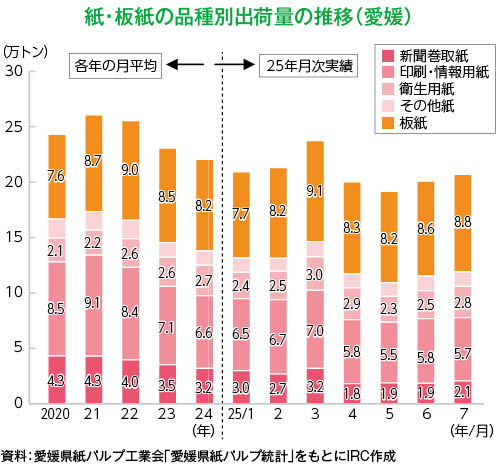 印刷・情報用紙の出荷量は、全国で前年同期(1~7月)比4.1%減、愛媛は同5.2%減となった。ペーパーレス化、電子媒体へのシフトが進んでいることが影響した。出荷量はコロナ前の19年比では、全国で32.6%減、愛媛は40.7%減であり、今後も需要減少が続く見通しだ。
