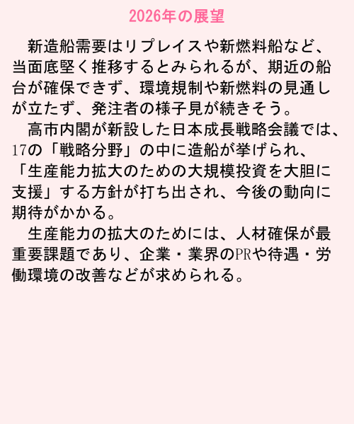 造船業界は、大手を中心に3~4年程度の潤沢な仕事量を確保している。船価は資機材価格・人件費などの高騰もあり、高止まりしている。日米協力を背景にした、日本の造船業再興に注目度が高まっている。