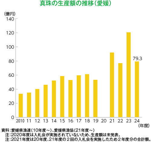真珠は、愛媛県漁業協同組合(以下、愛媛県漁協)主催の2024年度入札会が予定通り実施された。数量は増加したものの、金額ベースでは79億3千万円と前年(120億4千万円)と比べて大幅に減少した。要因として、昨年の単価が高過ぎたことの反動や中国景気の落ち込みに伴う中国人の購買意欲減退の影響が考えられるが、例年並みの水準に戻ったといえる。愛媛県漁協によると「香港でのジュエリーショーは活気がなかったが、国内需要は祝い事やフォーマル用などが底堅い」とのことである。