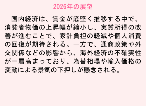日本経済は、物価高の影響で実質所得が伸び悩むものの、雇用・所得環境の改善が続き、緩やかな回復基調となった。トランプ関税などの下押し要因により、輸出産業を中心に弱い動きも見られたが、大阪・関西万博の開催により国内外からの来訪者が増加し、観光産業は活況を呈した。