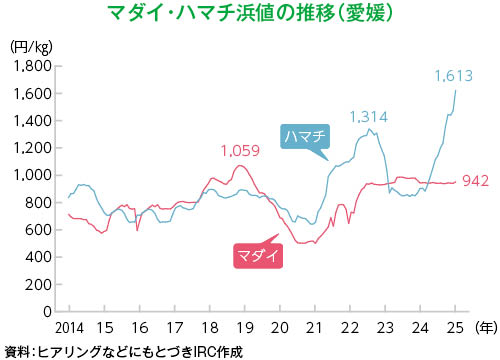 ハマチの浜値は、2024年下期から在池尾数の少なさを背景に上昇し始め、直近25年9月は1,600円/kg前後と最高値圏で推移している。猛暑による高水温のため、夏場の食欲減退からサイズは小型化している。冬の本格需要期を前に単価の上昇傾向は続く見通しだが、あらゆる食品、日用品が値上がりするなか、小売価格が上がり過ぎると店舗側に敬遠される懸念がある。