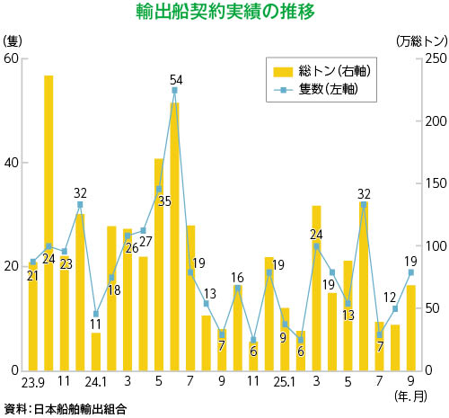 1~9月の輸出船契約実績をみると、93隻・432万総トンで前年同期比31.0%減だった。数年先まで船台が埋まり、船価の高騰や環境規制・新燃料船の動向が不透明なことなどを背景に、引き合いは低調に推移した。船種別にみると、バルカー(ばら積み船)が全体の8割を占めた。その他、昨年までは少なかった大型タンカー(VLCC)は受注したが、世界的に需要が増大しているLNG船は、今年も日本の造船所は受注できなかった。