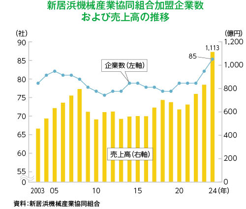 新居浜機械産業協同組合の組合員企業の売上高は、全体では新規加入企業があって増加したが、新規加入分を除くとやや減少。トランプ関税による大手企業の設備投資控えによる間接的影響もあり、例年並みの受注環境に落ち着いている。