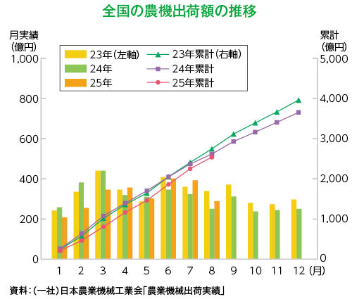 農業機械の出荷額は、年初は前年を下回る水準が続いたが、米価格上昇による農家の投資意欲回復で、夏以降の出荷額は持ち直しの傾向にある。