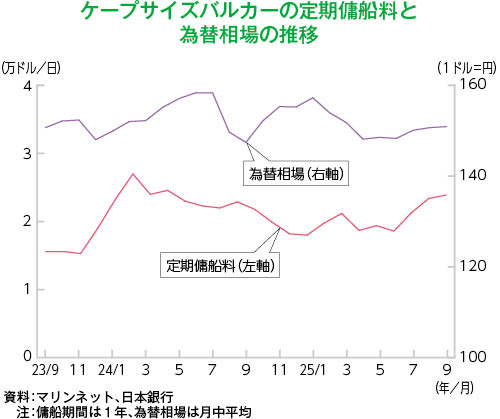 遠洋は、主力のバルカー(ばら積み船)の荷動き・市況をみると、バルチック海運指数(BDI)は、年明けに700台まで低下したが、9月時点では2,000台前後まで回復した。大型のケープサイズの定期傭船料(傭船期間1年)鉄鉱石の輸送が堅調に推移し、年後半には採算ラインを上回る25,000ドル/日前後まで上昇した。中小型のパナマックスやハンディマックスなどは、中国経済の減速を背景に低水準で推移した。