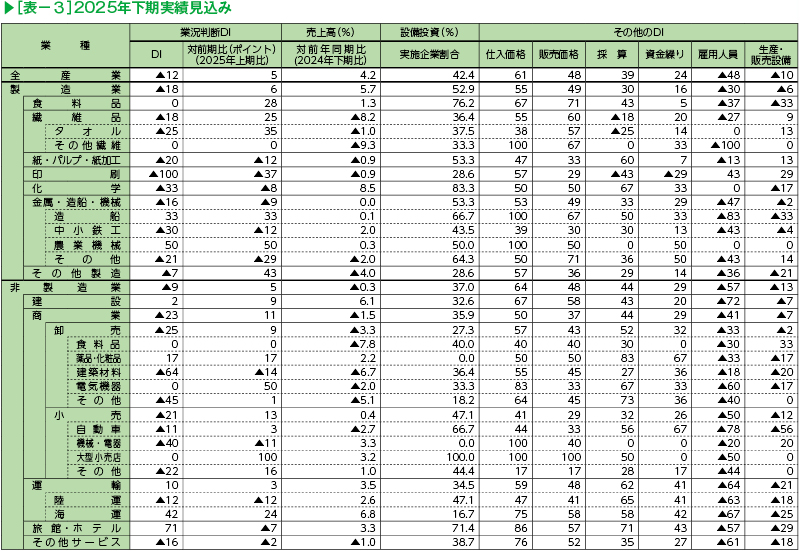1.愛媛県内企業の2025年下期(7~12月)の業況判断DIは、日米関税交渉が合意に至ったことによる警戒感の低下や好調なインバウンド需要を背景に、▲12(前期比5ポイント改善)となった。