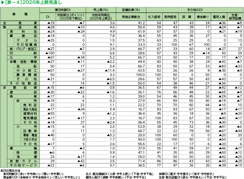 2026年上期見通しの業況判断DIは、ほとんどの業種で悪化となった。