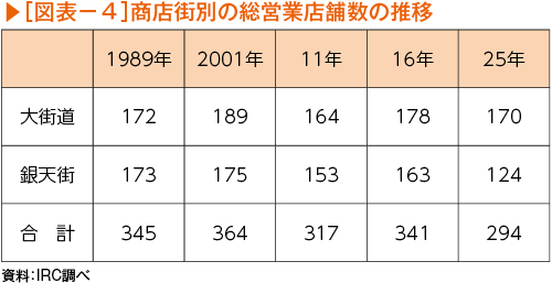現地調査の結果、直近(25年12月時点)の大街道・銀天街で営業中の店舗数は294店舗と16年調査と比較して47店舗減少(▲13.8%)していた。これまで増減を繰り返しながらも300店以上が営業していたが、300の大台を割り込んだ(図表-4)。商店街別にみると、大街道は8店舗の減少(▲4.5%)であるのに対して、銀天街で39店舗減少(▲23.9%)と顕著である。