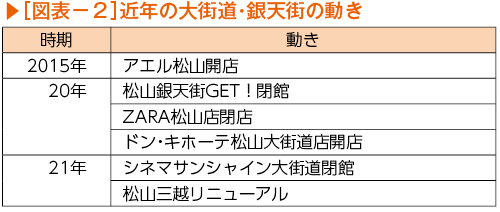その後の約10年間の動きをみると、L字地区の中核であった「松山銀天街GET!」が20年9月に閉館したほか、21年には商店街内にあった映画館「シネマサンシャイン大街道」も閉館した(図表-2)。また、老舗の時計店や靴店、書店などの閉店も相次ぎ、新型コロナウイルスの感染拡大で打撃を受けた飲食店や若者向けアパレルショップなども多数休業・閉店した。