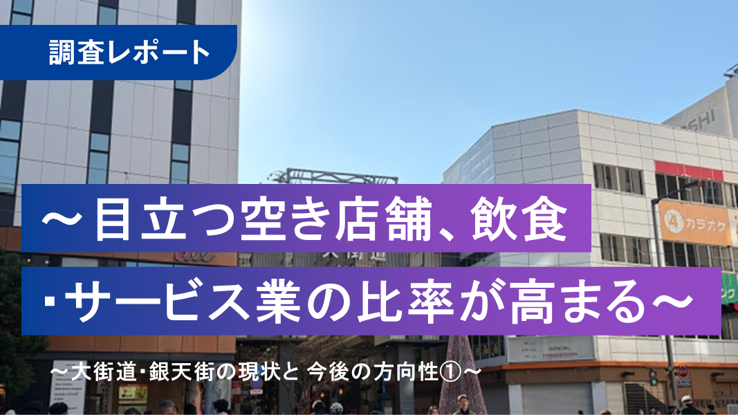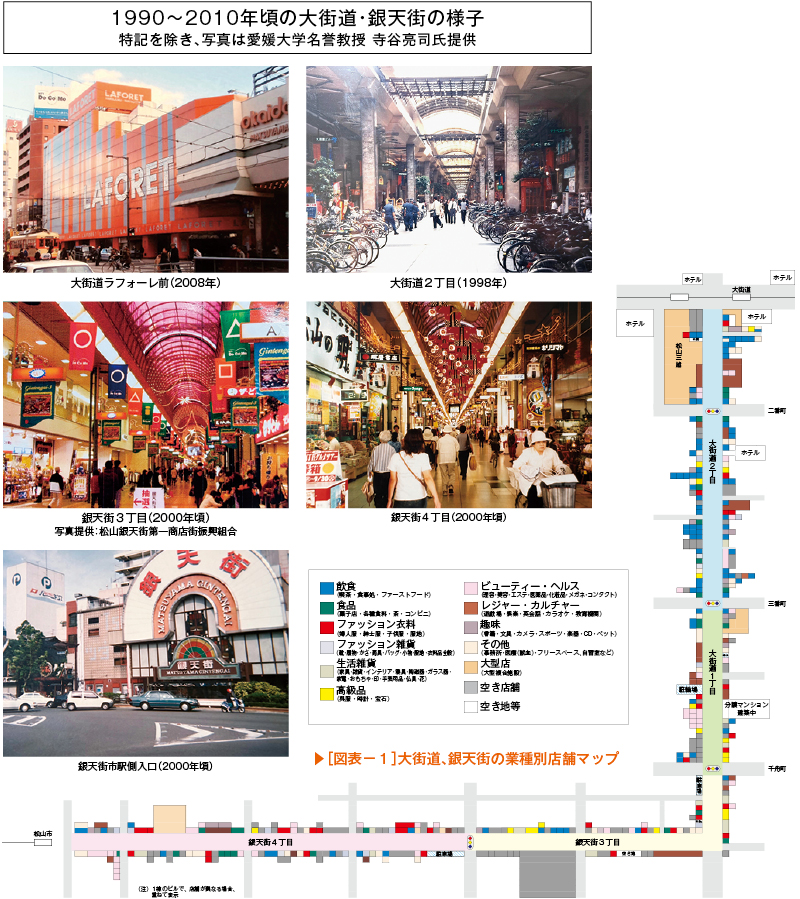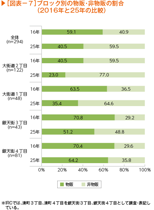とくに大街道では7割程度が「非物販」を占め、「もはや商店街ではない。飲み屋街だ」「飲食店に貸すのをためらうオーナーが少なくなった」「エリアによっては、夜のほうが人通りは多い」(いずれも商店街関係者)などの声が聞かれた。