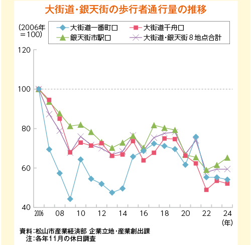 2006年を100として、大街道・銀天街の歩行者通行量の推移を見ると、13年までは減少から横ばいで推移した。アエル松山の開業後に回復したものの、コロナ禍で再び大きく減少し、足元は06年比で4割程度下回って推移している。