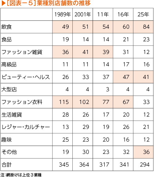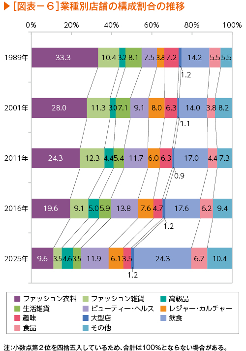 店舗の業種別構成割合の推移をみても、「ファッション衣料」(9.6%)や「ファッション雑貨」(3.5%)などの低下は顕著である。一方、「飲食」(24.3%)や「その他」(10.4%)などの構成比は上昇している(図表-6)。