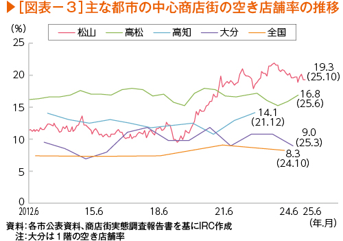 公表資料によると、松山市中央商店街の空き店舗率は、2010年代は10%台で推移し、コロナ前の2019年には10%を切る時期もあり「過去は近隣・同規模の都市にある中心商店街と比較すると健闘していた」(商店街組合役員)との見方もあった。しかしながら、コロナ禍に空き店舗率は急上昇し、ピークの24年1月には、21.8%となった。その後はやや低下したものの、依然として20%前後で推移している(図表-3)。商店街実態調査報告書(全国商店街振興組合連合会)によると、大街道・銀天街が区分される「広域型商店街」※の2024年10月時点の空き店舗率(全国平均)は8.3%であり、大街道・銀天街の空き店舗率が高水準にあることがうかがえる。