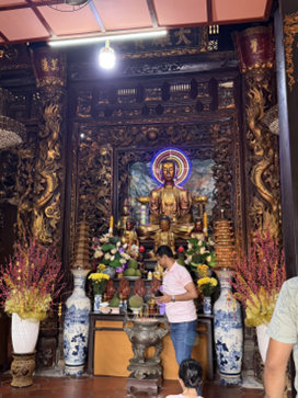 満月や新月の日には、アオザイ姿の女性たちがお寺に参拝し、家族の健康や商売繁盛を祈る姿も珍しくありません。