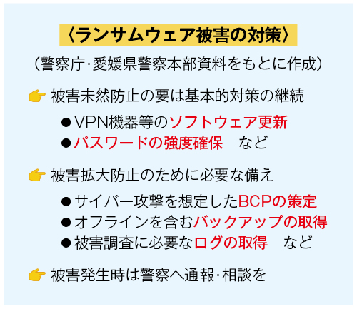 万が一被害に遭った場合、すぐにネットワークから端末を切断し、感染拡大を防止しなければならない。「侵入経路等のログを確認するため、電源は切らない」(愛媛県警察本部)とのことだ。その後、警察や専門業者へ通報・連絡し、感染範囲の特定やバックアップデータからの復旧などを迅速に進めることが重要である。身代金の支払いに関しては、「犯罪グループ等の活動資金となることが懸念される。暗号化されたデータの復号が保証されるわけではない」(同)と話す。