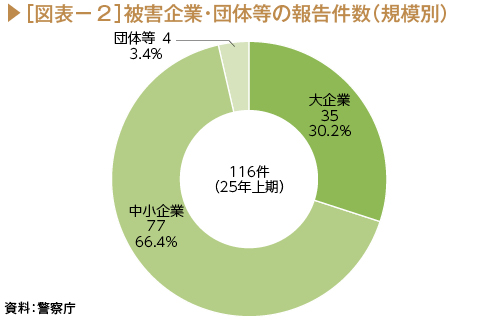 昨年は法人向け大手通販サイトや大手飲料メーカーなどがターゲットにされたため、ランサムウェア被害が注目された。しかし、被害件数(報告ベース)の割合を企業規模別にみると、25年上期は「中小企業」が66.4%で最も高い(図表-2)。IRCが行ったアンケートでも、「サイバー攻撃、システム障害」をBCPの対策としている企業は29.0%と低いことからも(2025年8月号「調査レポート」に掲載)、セキュリティ人材不足や予算制約、従業員への周知徹底がなされていないことなど、中小企業特有のリスクが攻撃・被害の一因となっているようだ。