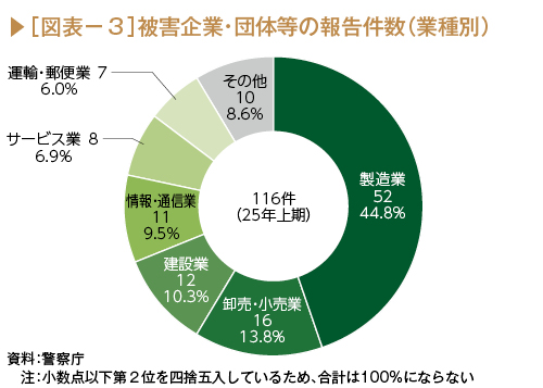 また、業種別にみると、「製造業」が44.8%で最も高く、「卸売・小売業」13.8%、「建設業」10.3%などとなっている(図表-3)。中小・製造業が狙われやすい理由として、①サプライチェーンや委託先などを経由して大企業のシステム・製造ラインへと被害を拡大させる、②図面やプログラムなどの重要データを復旧するため、高額な身代金を要求できる、③VPN機器※1やセキュリティソフトなどの更新やバッチの適用漏れといったセキュリティ対策が不十分である、などが挙げられる。