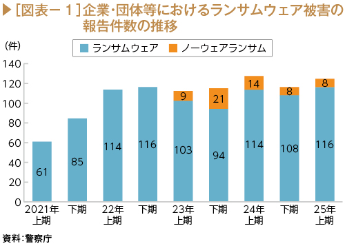 被害を受けると、業務停止や顧客・機密情報の流出、信用失墜といった重大な影響が及ぶ。警察庁が公表している被害の件数は2021年から22年にかけて急増し、その後も年間100件以上で推移している(図表-1)。愛媛県警察本部サイバー犯罪対策課の担当者は「報告されないケースもあるので、実際の被害件数は統計よりも多いとみられる。また、愛媛県内でもランサムウェア被害は発生している。」と話す。