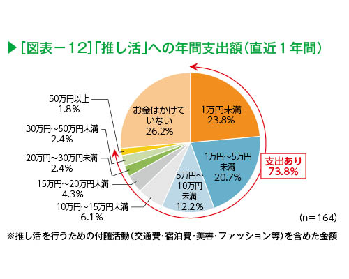 「推し活」への年間支出額は、「1万円未満」(23.8%)が最も多く、次いで「1万円~5万円未満」(20.7%)、「5万円~10万円未満」(12.2%)と10万円未満が半数を超えた(図表-12)。10万円以上とあわせると73.8%が推し活にお金をかけている。推し活消費は、「推しに会う」ための「旅行」など付随的な消費も多いという点で外出型消費全般にプラスの影響がある。