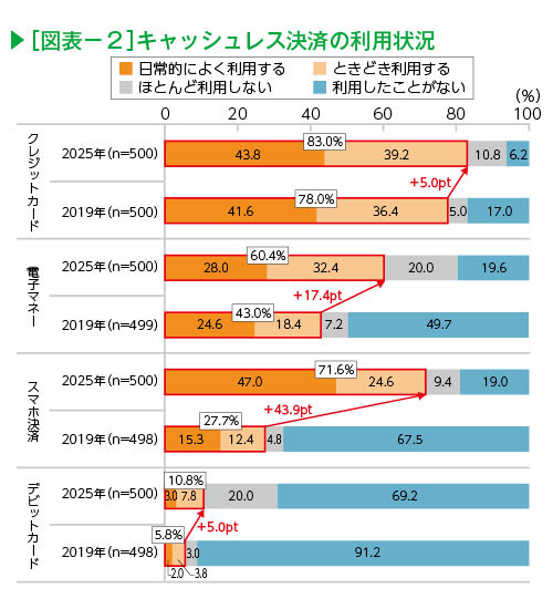 キャッシュレス決済の利用状況を2019年調査と比較すると、すべての決済手段で利用が増加した(図表-2)。特に「スマホ決済」は「利用する」(「日常的によく利用する」と「ときどき利用する」の合計)が2019年比43.9ポイント増の71.6%となった。新型コロナによる非接触ニーズの高まりに加えて、スマホの普及に伴う手軽さとポイント還元などにより、利用促進につながったと考えられる。