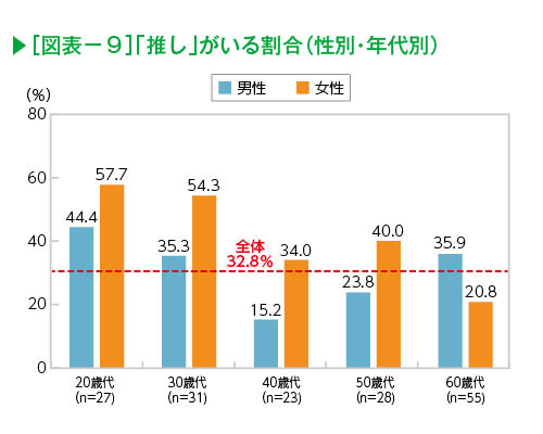 「推し」がいる割合を性別、年代別にみると、女性は60歳以上を除くすべての年代で全体を上回った(図表-9)。20歳代では57.7%、30歳代でも54.3%と若年女性を中心に「推し」の存在の多さがみられる。また、男性でも30歳代と60歳以上では、3割を超えるなど幅広い年代・性別で「推し」の存在が確認された。