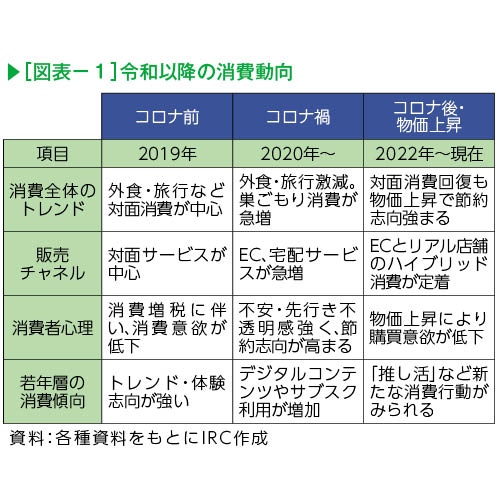 2019年以降、新型コロナの感染拡大により外出制限が実施され、消費行動が大きく変化した(図表-1)。コロナ前は対面消費が中心だったが、外出自粛により巣ごもり需要が増加し、家で過ごす時間を充実させる商品やサービスの需要が拡大。非接触ニーズの高まりを受けて、オンラインショッピングやキャッシュレス決済が普及した。