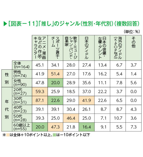 男女別では、「スポーツ選手・チーム」で男性51.4%、女性20.0%と大きな差がみられた(図表-11)。年代別では、「アニメ・漫画などの作品・キャラクター」は若年層で高く、特に30歳代は87.1%と突出している。また、50歳代は「歌手・ミュージシャン・バンド・音楽家」(46.4%)、60歳以上は「スポーツ選手・チーム」(47.3%)で全体を10ポイント以上上回った。