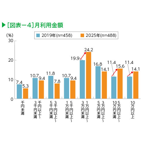 月利用額は「1万円以上~3万円未満」が最も多く、24.2%となった。2019年と比較すると、「5万円以上10万円未満」(11.4%→15.6%)と「10万円以上」(11.4%→14.1%)の合計が約3割となっており、全体的に利用額が増加している(図表-4)。