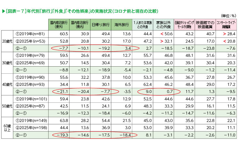 40歳代では、「国内旅行(県外・県内)」が他の年代と比べて大きく減ったものの、「日帰り旅行」は減少幅が少ない。40歳代は子育て世代で物価高の影響を多く受けるため、節約志向が広がっている可能性がある。